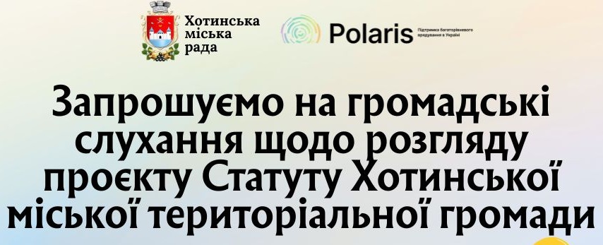 Хотинська міська рада повідомляє, що 10 листопада 2025 року о 16:00 у залі засідань Хотинської міської ради відбудуться громадські слухання щодо обговорення проєкту Статуту Хотинської міської територіальної громади