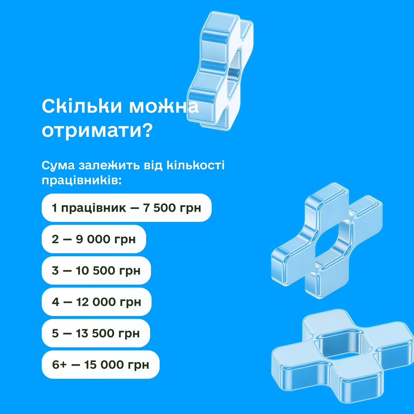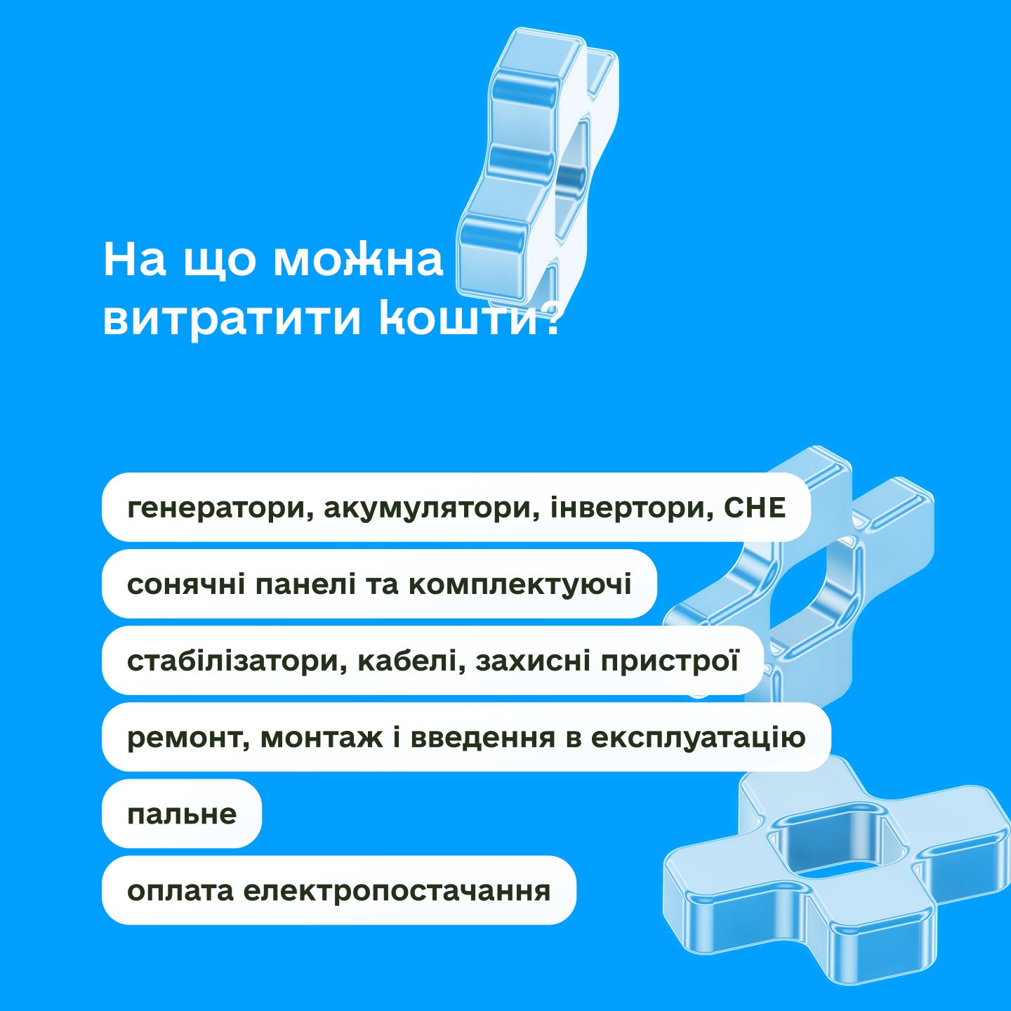 Розмір допомоги становить від 7 500 до 15 000 гривень і залежить від кількості найманих працівників. Підприємці можуть використати кошти на придбання генераторів, акумуляторів, інверторів, сонячних панелей та комплектуючих, стабілізаторів і захисних пристроїв, пального для генераторів, оплату електропостачання, а також монтаж і введення обладнання в експлуатацію.