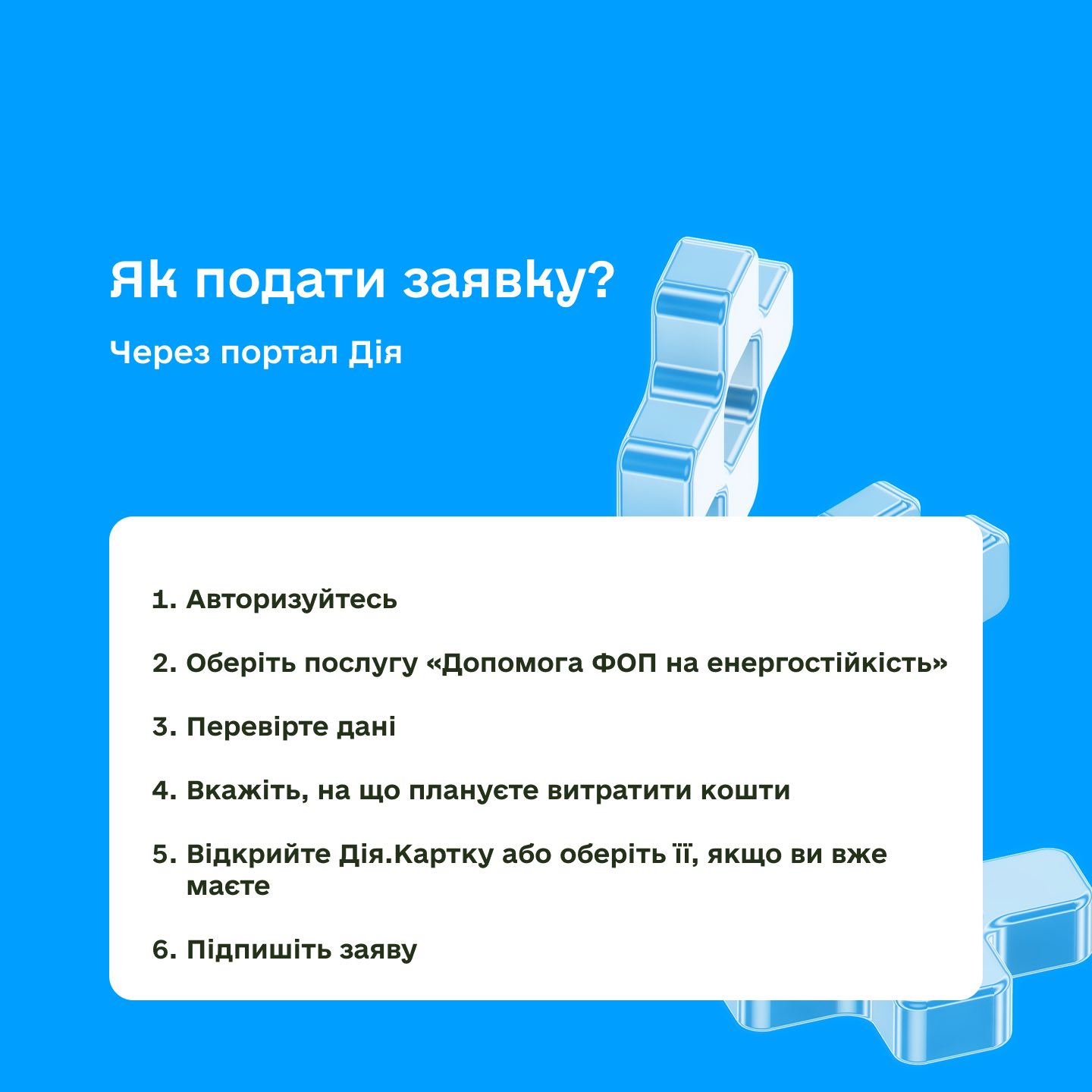 Щоб отримати допомогу, необхідно авторизуватися на порталі «Дія», обрати послугу «Допомога ФОП на енергостійкість», перевірити власні дані, зазначити напрям використання коштів, підтвердити їх цільове призначення, відкрити або обрати Дія.Картку, підписати заяву та очікувати рішення.