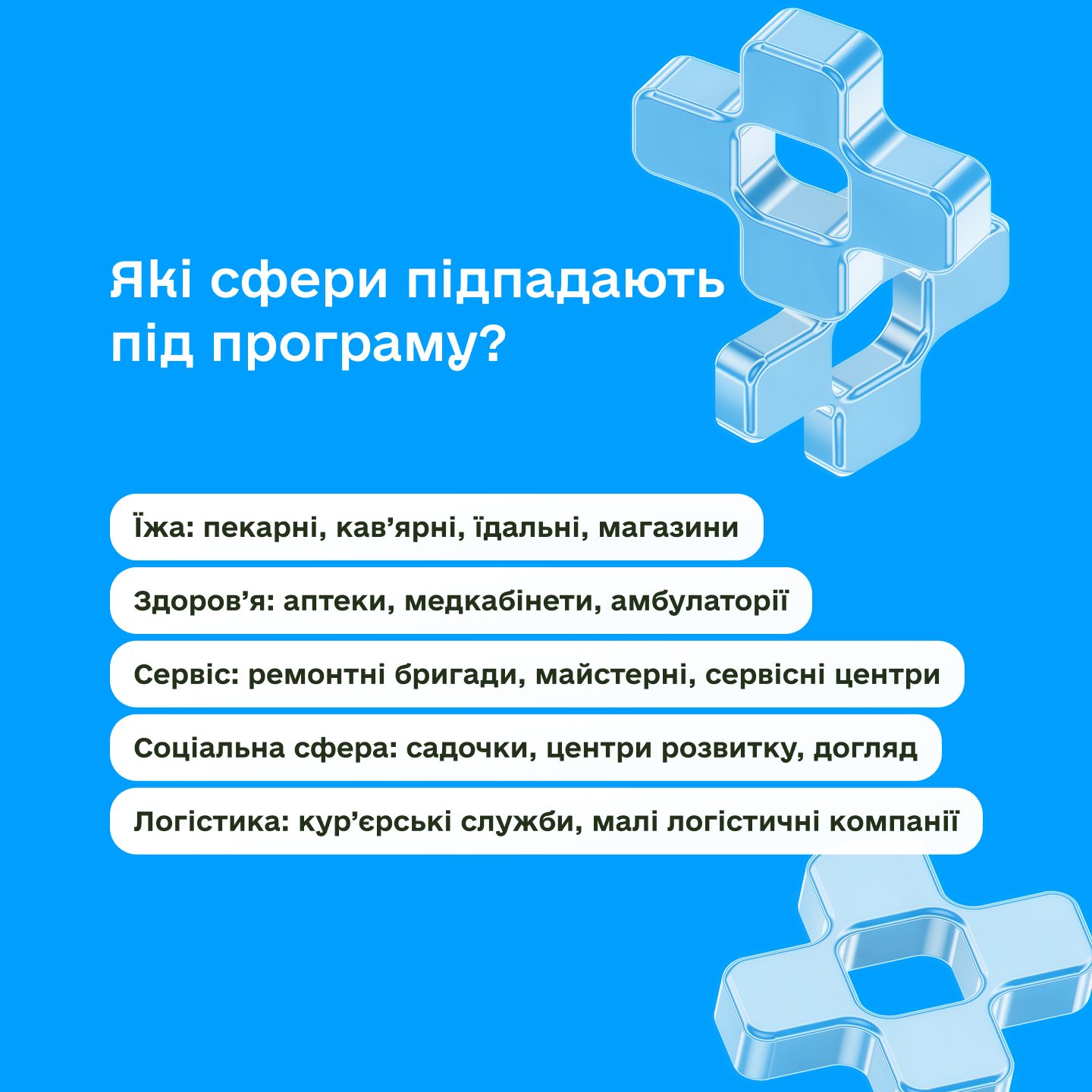 Серед таких сфер діяльності виробництво та продаж продуктів харчування, робота аптек і приватних медичних кабінетів, ремонтні та сервісні послуги, діяльність закладів соціальної підтримки, логістичні та кур’єрські послуги та інші види бізнесу, що забезпечують життєдіяльність громад.