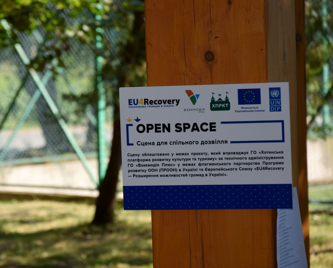 Проєкт «Open space: облаштування громадського простору в міському парку Хотина для спільного дозвілля» впроваджено ГО «Хотинська платформа розвитку культури і туризму» за технічного адміністрування ГО «Взаємодія Плюс» за сприяння Програми розвитку ООН (ПРООН) в Україні за фінансової підтримки Європейського Союзу, наданої в межах проєкту«EU4Recovery – Розширення можливостей громад в Україні».