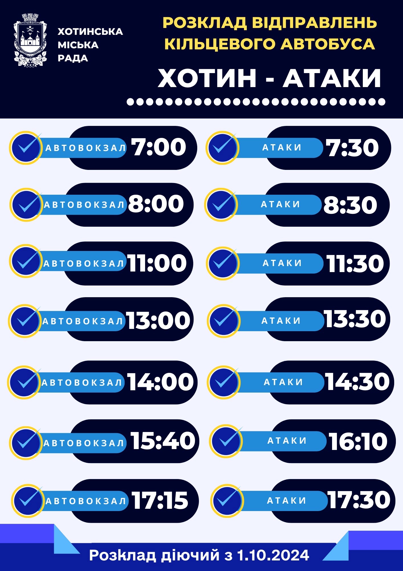Уже 8 місяців, щотижня по 38 рейсів, відпрацював наш перший безкоштовний муніципальний транспорт!!! Щоранку він із 7:00 ранку виходить на маршрут і дотемна розвозить пасажирів різного віку – від школярів до пенсіонерів, які добираються з відділених мікрорайонів міста і села Атаки до центру Хотина, автовокзалу, навчальних закладів тощо.