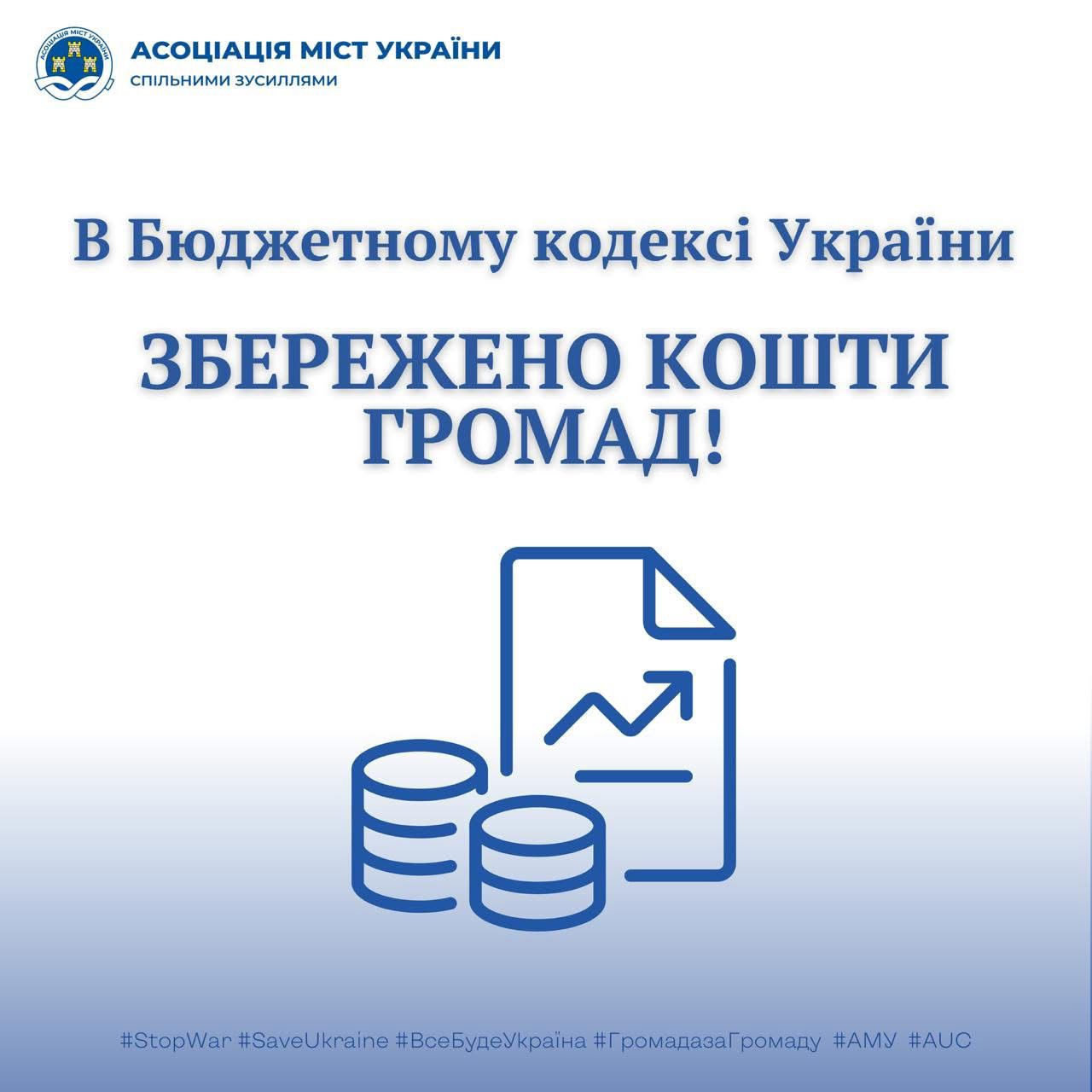 Завдяки представленій Асоціацією міст України єдиній позиції місцевого самоврядування та системній роботі з народними депутатами України, в бюджетах громад збережено 9 млрд гривень.